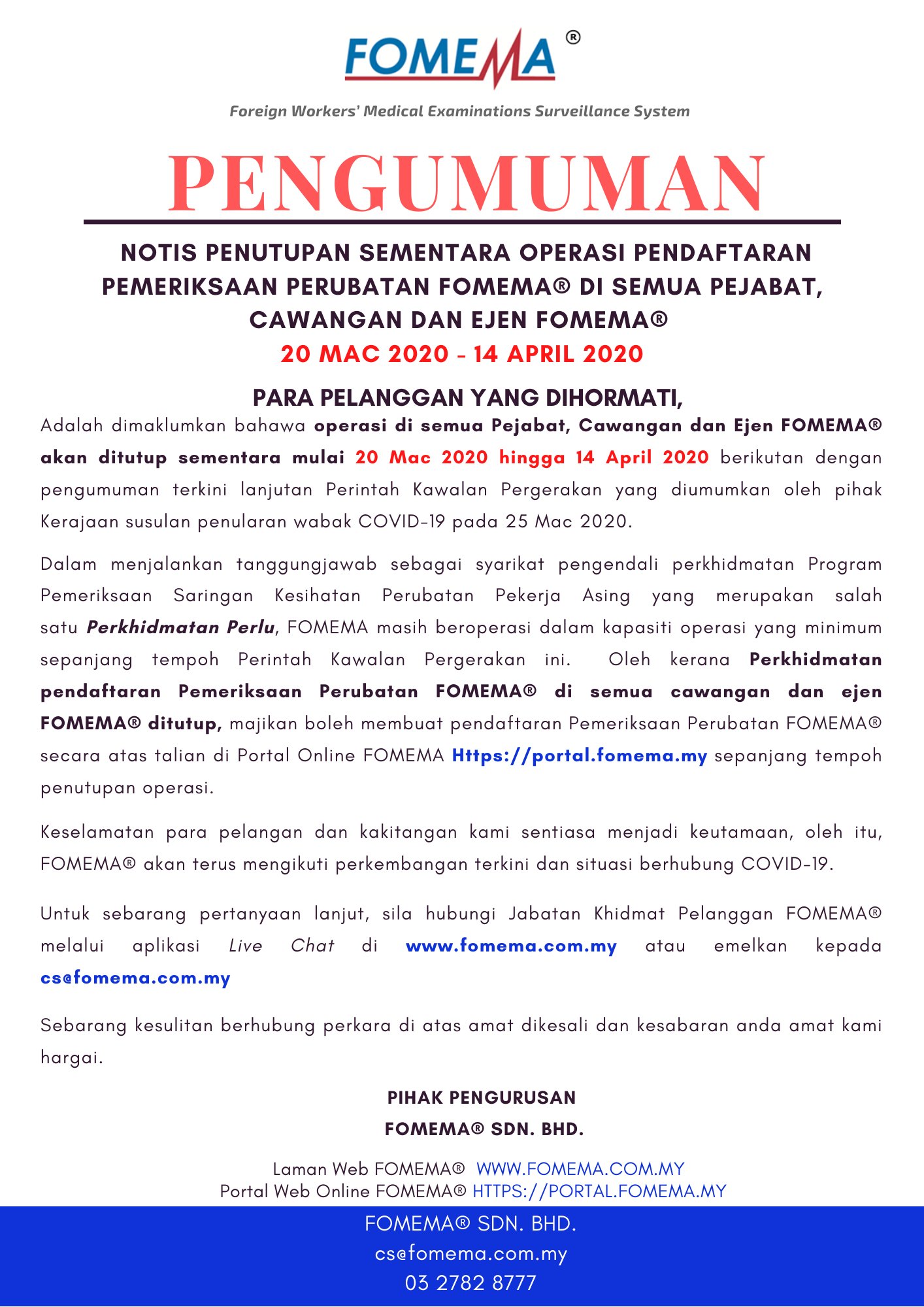 Fomema On Twitter Updated On 27 March 2020 Notice Announcement On The Extension Temporary Closure Of The Registration For Fomema Medical Examination At All Fomema Offices Closure Until 14 April 2020 Https T Co Lvto3zolyb