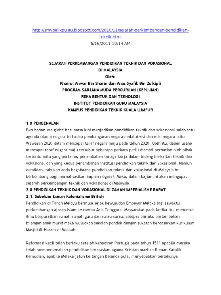 Kvbl Kolej Vokasional Batu Lanchang 8 Februari 2009 Sejarah Perkembangan Pendidikan Teknik Dan Vokasional Di Malaysia Sejarah Perkembangan Pendidikan Teknik Dan Vokasional Di Malaysia Oleh Khairul Anwar Bin Sharin Dan