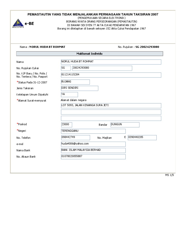 Maklumat Individu Pemastautin Yang Tidak Menjalankan Perniagaan Borang Nyata Individu Tahun Taksiran