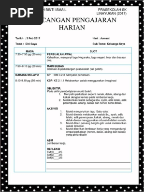 Rancangan Pengajaran Harian Nur Hidayah Binti Ismail Prasekolah Sk Linayukan 2017
