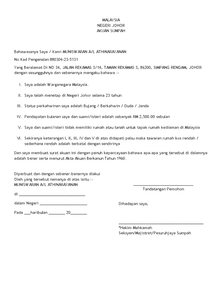 Pesuruhjaya Contoh Surat Akuan Sumpah Tidak Bekerja