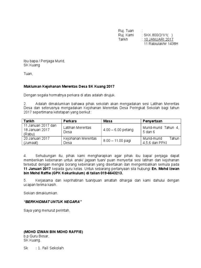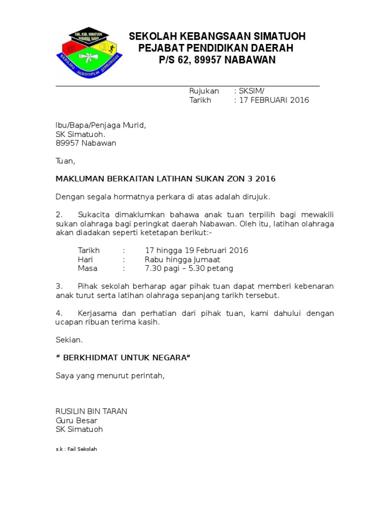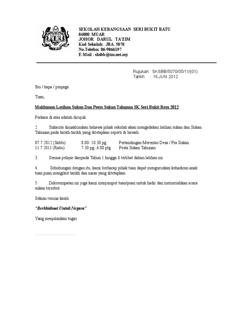 Contoh Surat Makluman Latihan Olahraga
