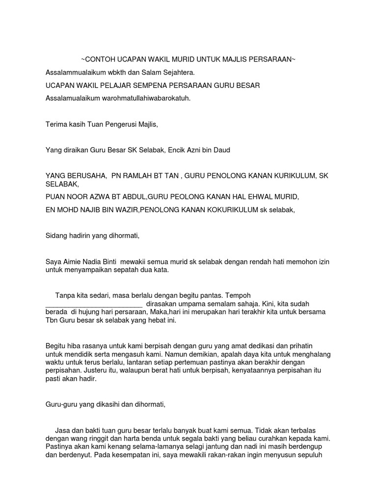 Doc Contoh Ucapan Wakil Murid Untuk Majlis Persaraan Linda Husin Academia Edu