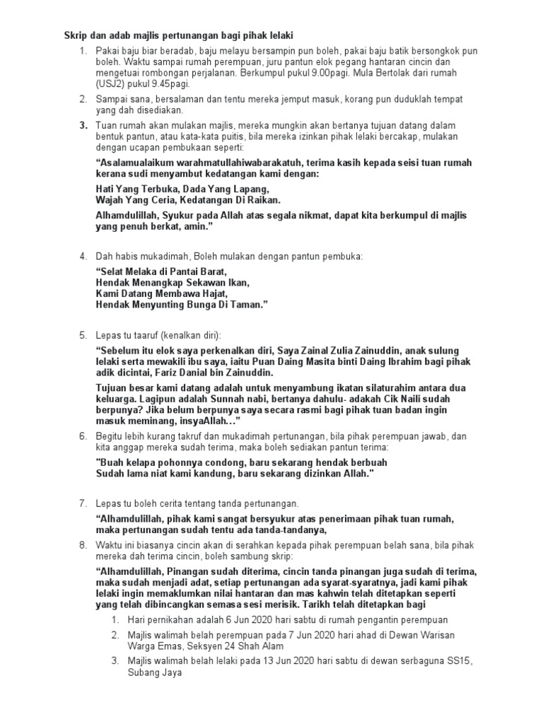June 19 2018 at 6 06 pm. Skrip majlis pertunangan pihak lelaki tanda kita dah tua selain orang panggil kita pakcik dan suruh ulang cakap sebab tak beberapa nak dengar tanda lain kita dah tua adalah bila ahli kelurga lantik korang jadi juru runding majlis pertunangan. Namun mesyuarat dalam majlis pertunangan bukanlah seperti mesyuarat di pejabat. Teks khutbah majlis pertunangan november 10 oktober 8 september 8 ogos 16 julai 10.