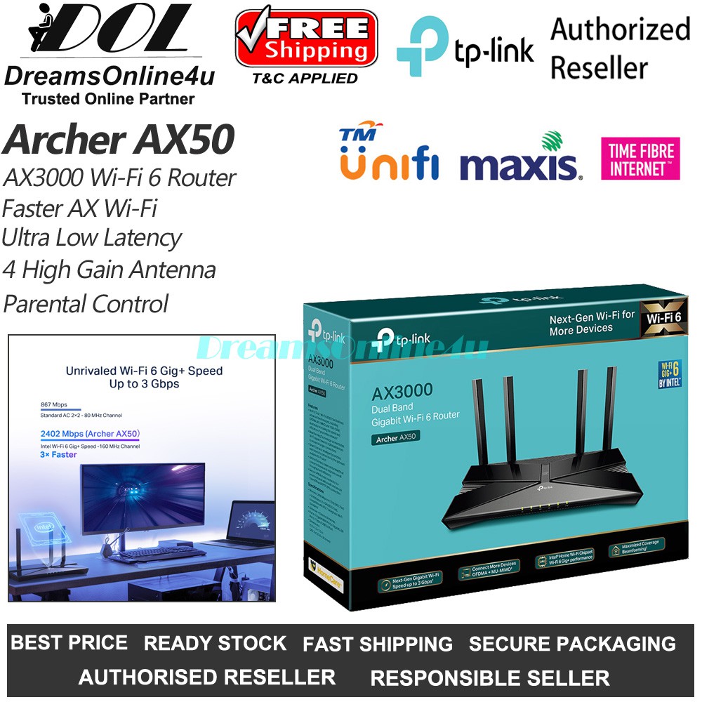 Tp Link Archer Ax50 Ax3000 Dual Band Gigabit Wi Fi 6 Router Unifi Time 3 Years Warranty Shopee Malaysia